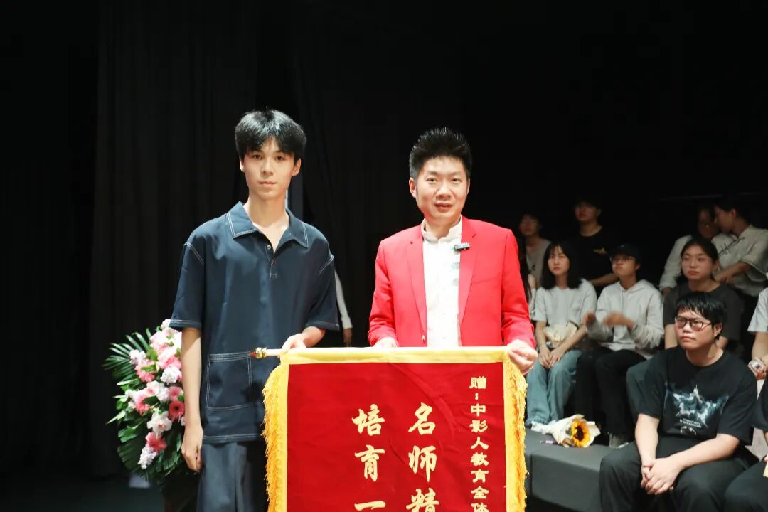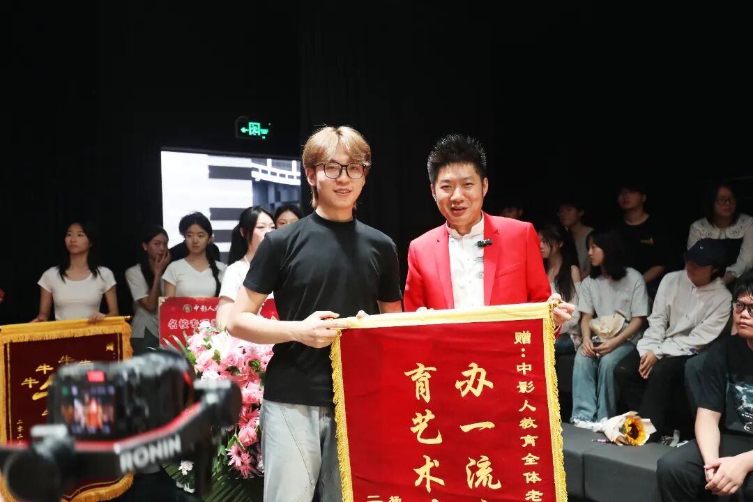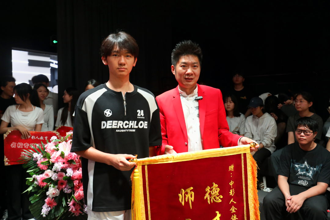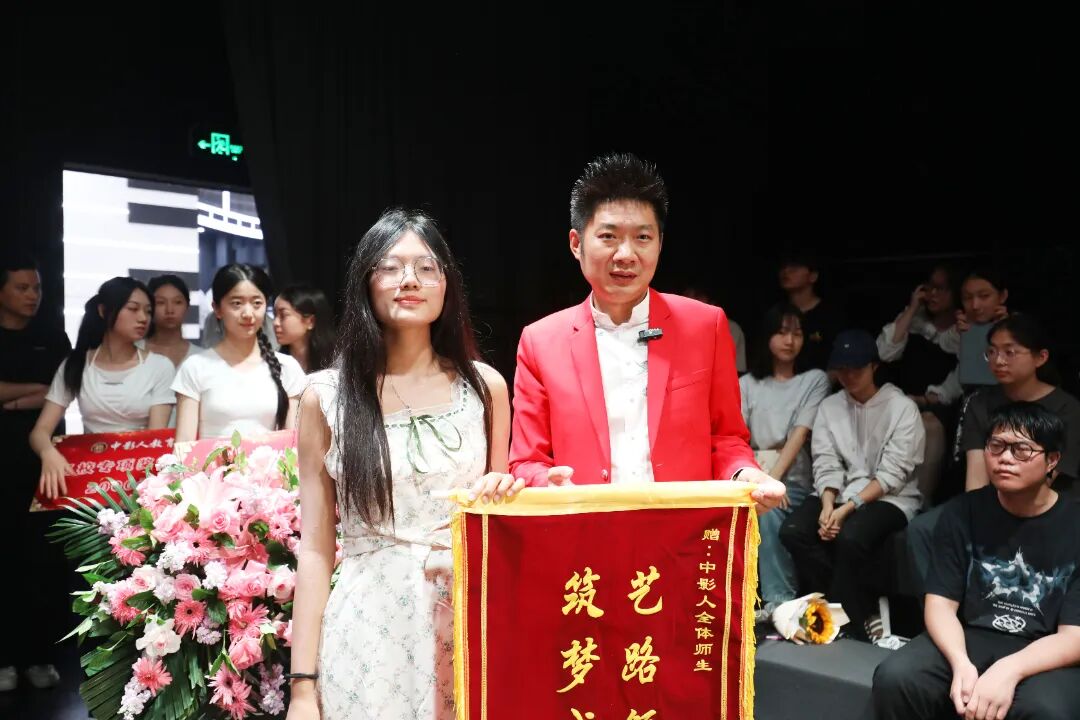 在开学典礼的现场,优秀毕业生代表纷纷献上锦旗来表达对中影人教育、老师们的深深感谢。