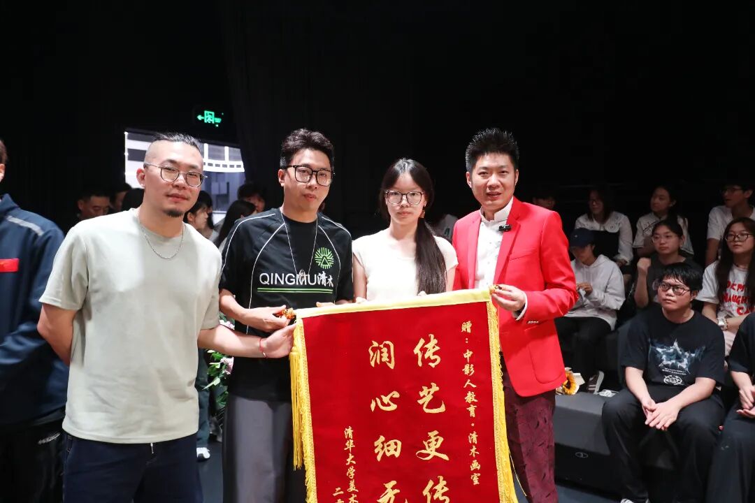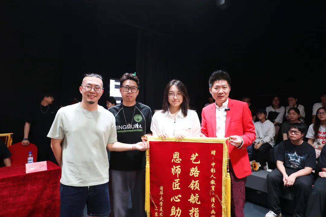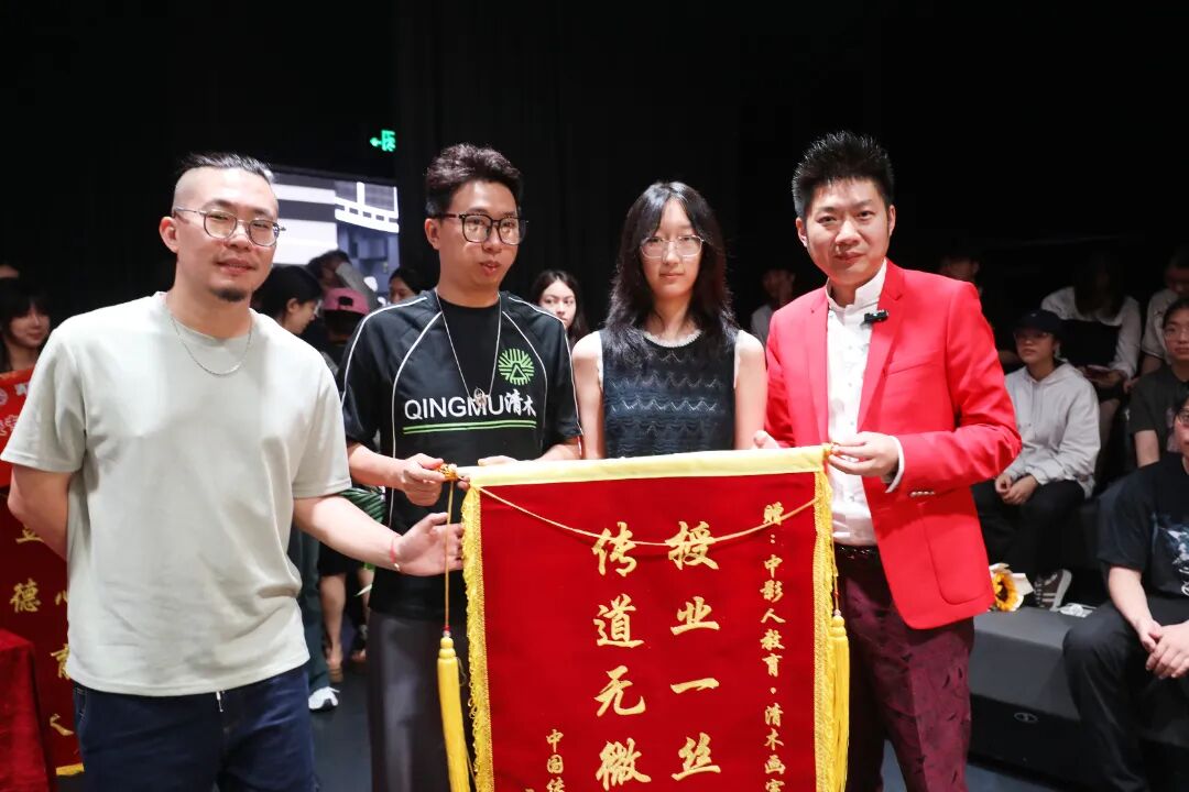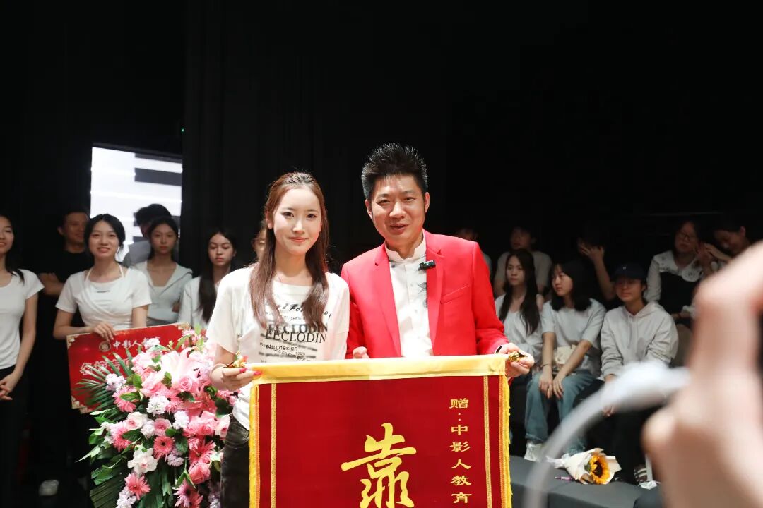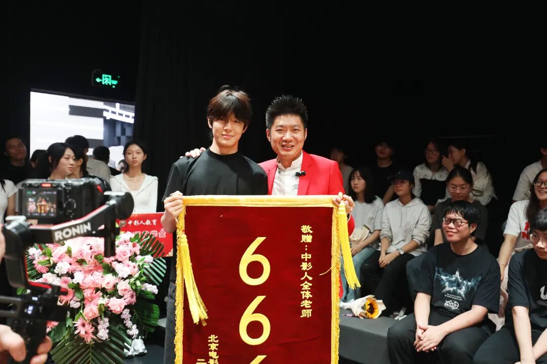 在开学典礼的现场,优秀毕业生代表纷纷献上锦旗来表达对中影人教育、老师们的深深感谢。